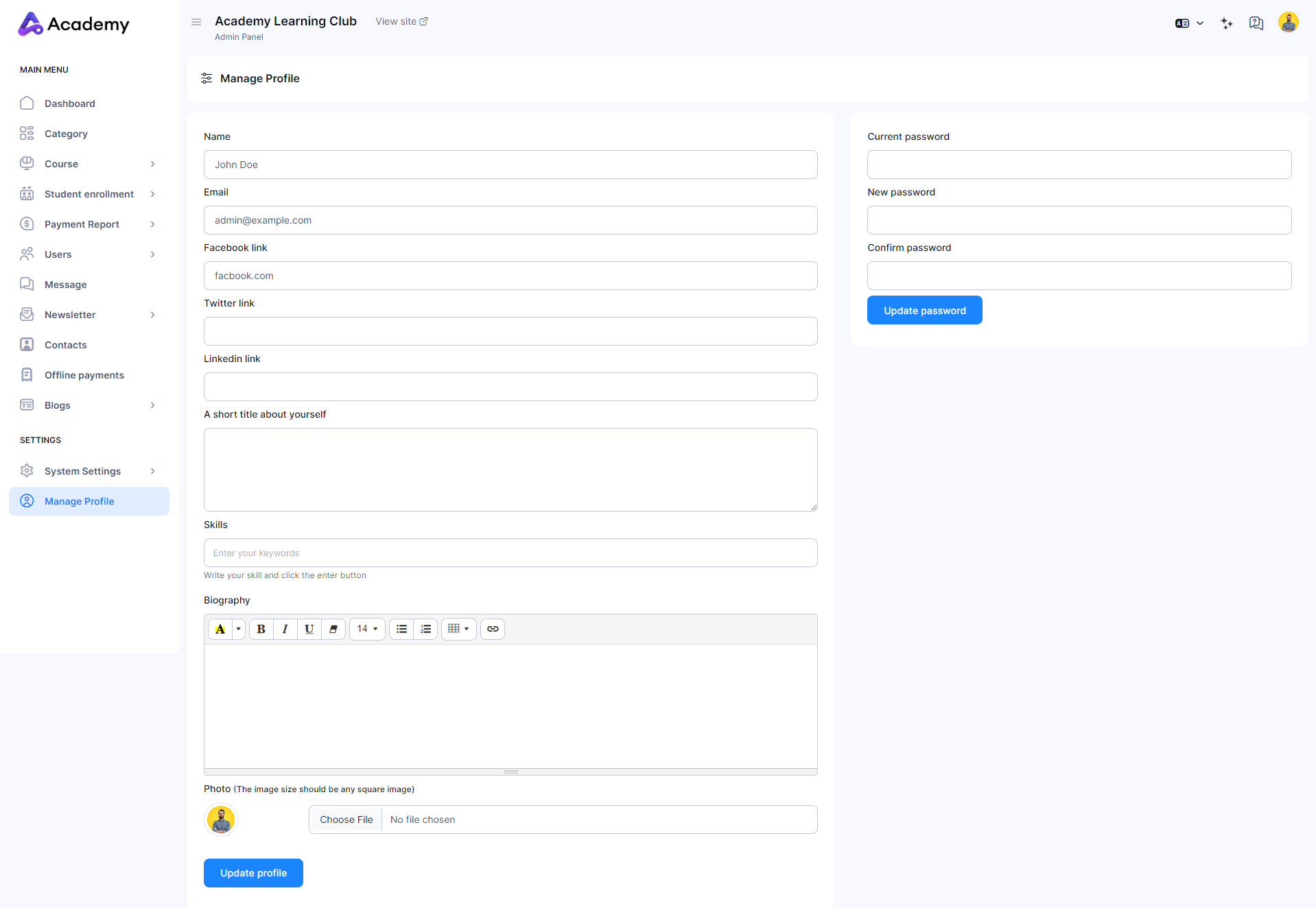 You can set up or update all of your details as an admin in your website through the profile settings by following the steps below: