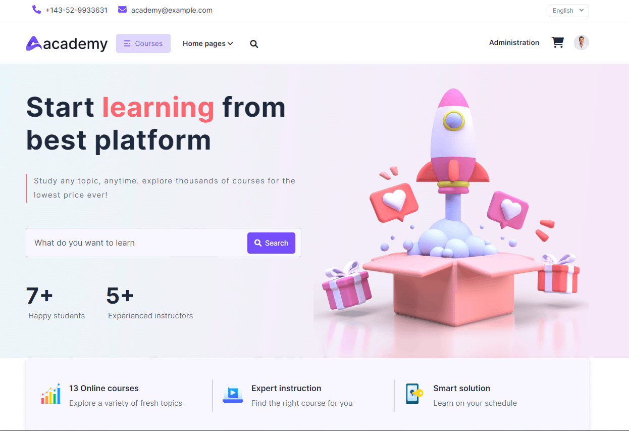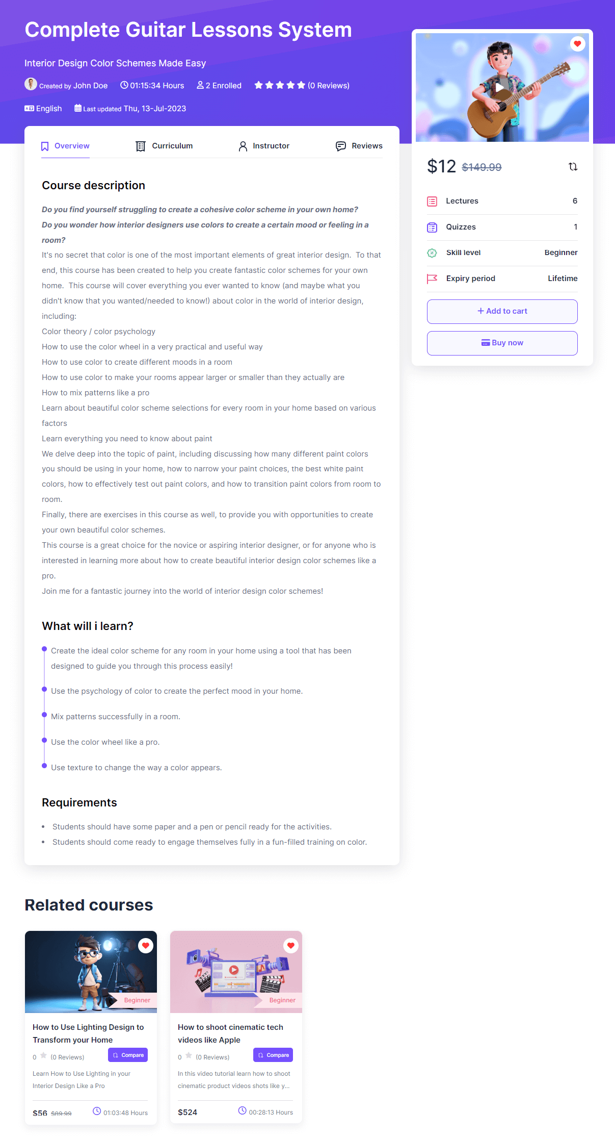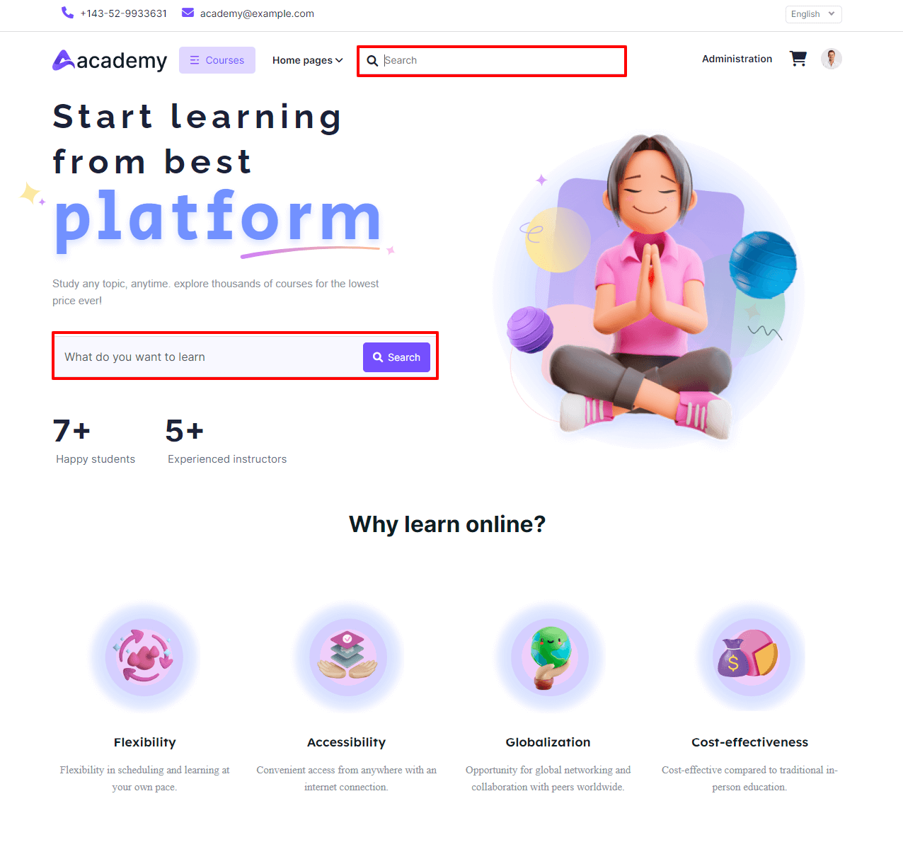 Users can filter Categories, Price, Level, Language, usage courses before signing up to Academy LMS and purchasing courses.