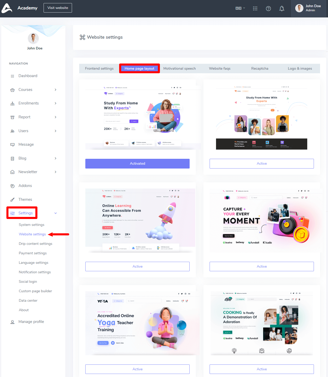 You will get 6 different attractive homepage layouts with Academy LMS version 6. To change the homepage layout, you can follow the steps below.