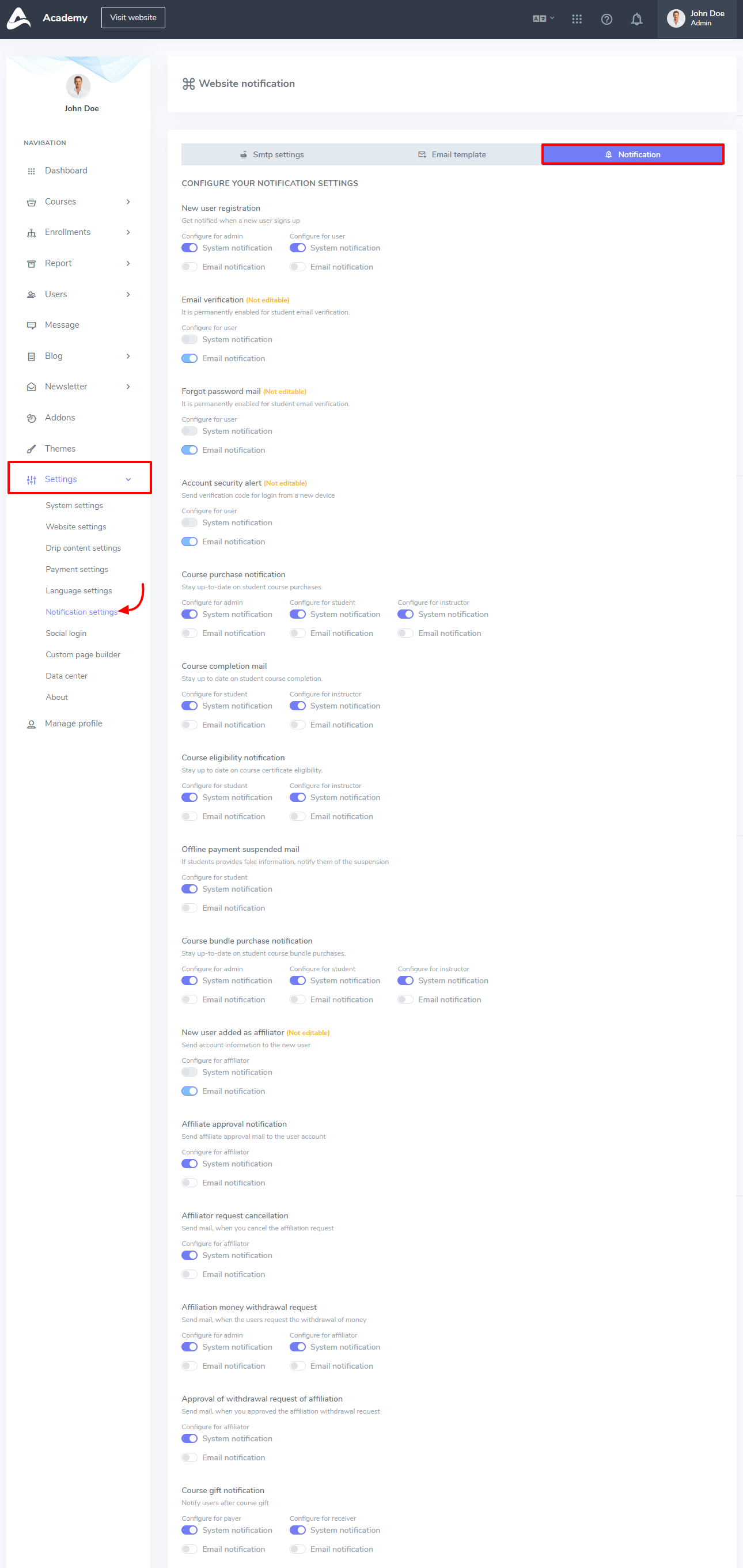 In Academy LMS, you can manage your system notification professionally by switching the button. In this panel, you manage new user registration, email verification, forgot password mail, account security alert, course purchase notification, course completion mail, course eligibility notification, offline payment suspended mail, course bundle purchase notification, new user added as an affiliate, affiliate approval notification, affiliate request cancellation, affiliation money withdrawal request, approval of withdrawal request of affiliation, and course gift notification.