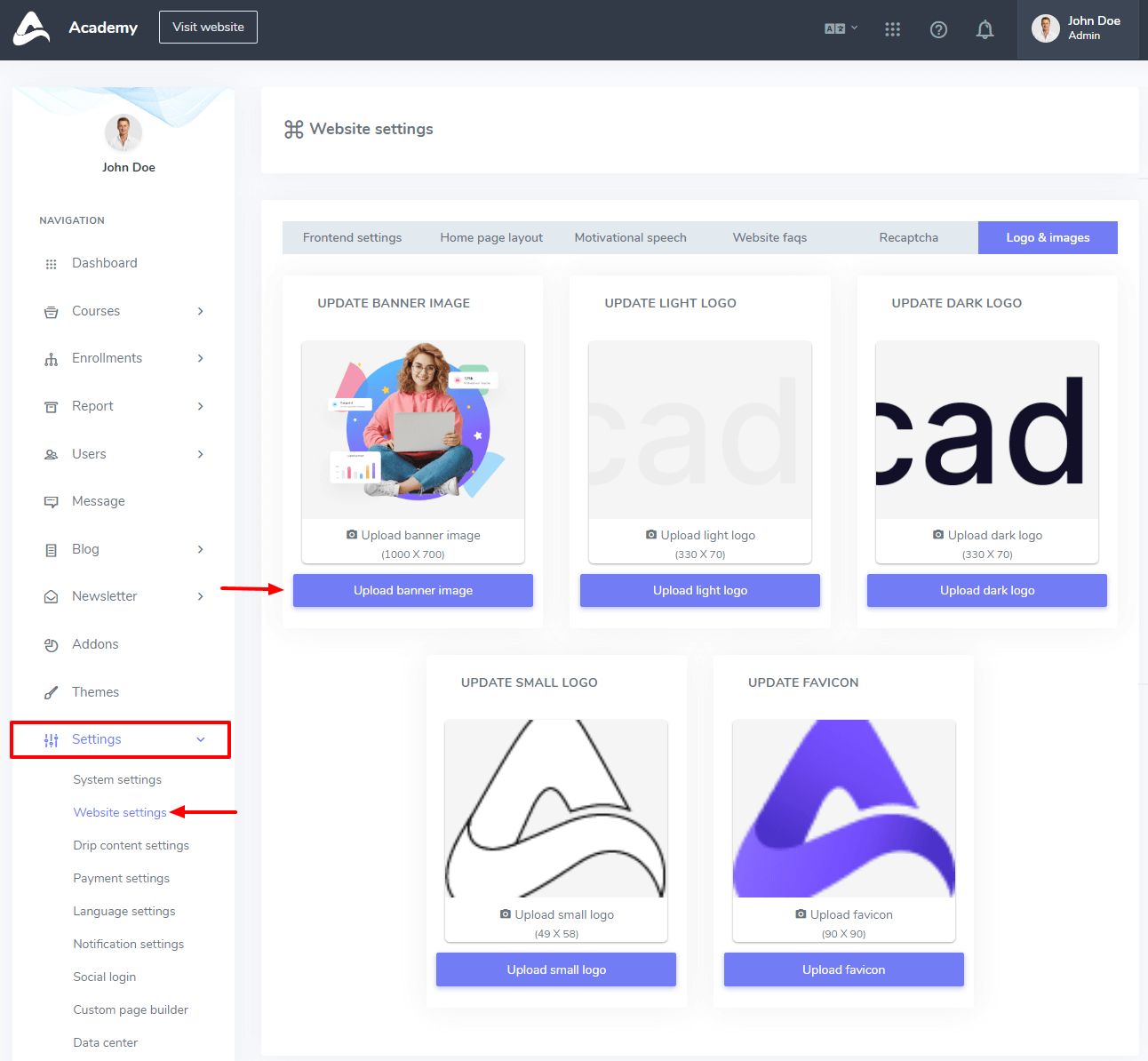 In this settings panel, you can configure your all settings which are related to your website. For example, Frontend settings, Homepage layout, Motivational Speech, Website FAQs, Recaptcha, and logo- images.