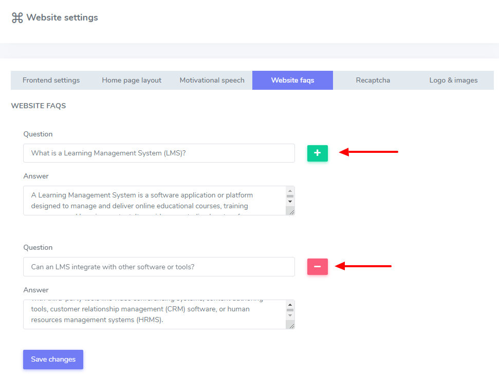 To add multiple FAQs, you can click on the "+" button or to remove a FAQ, click on the "-" button.