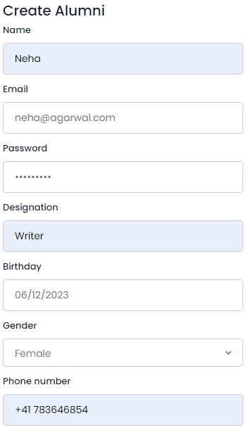 The administrator has access to create alumni. Alumni can edit and update their information after receiving login details from the admin. The following actions could be useful for that: