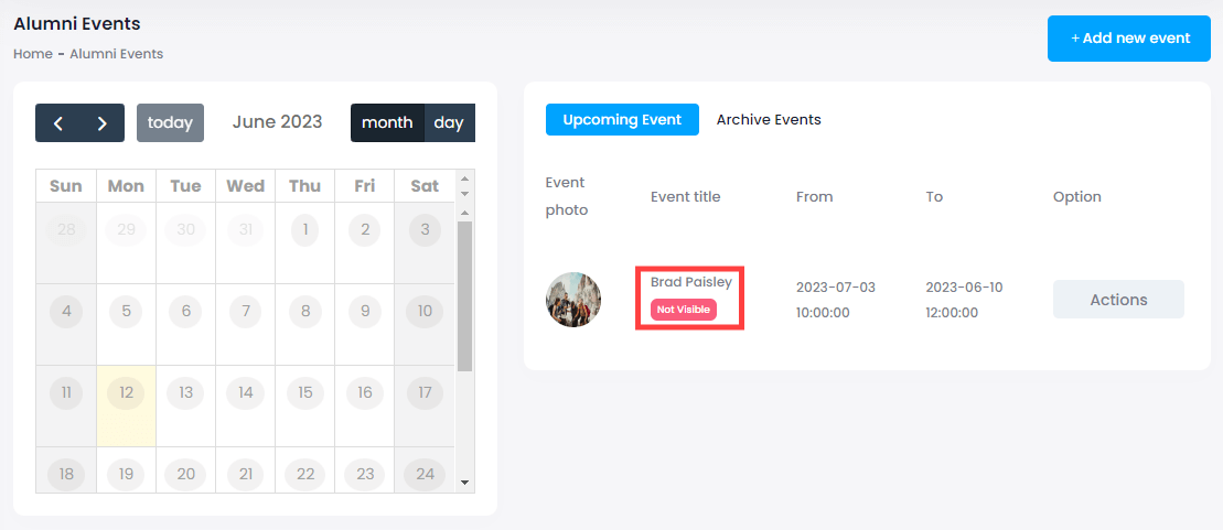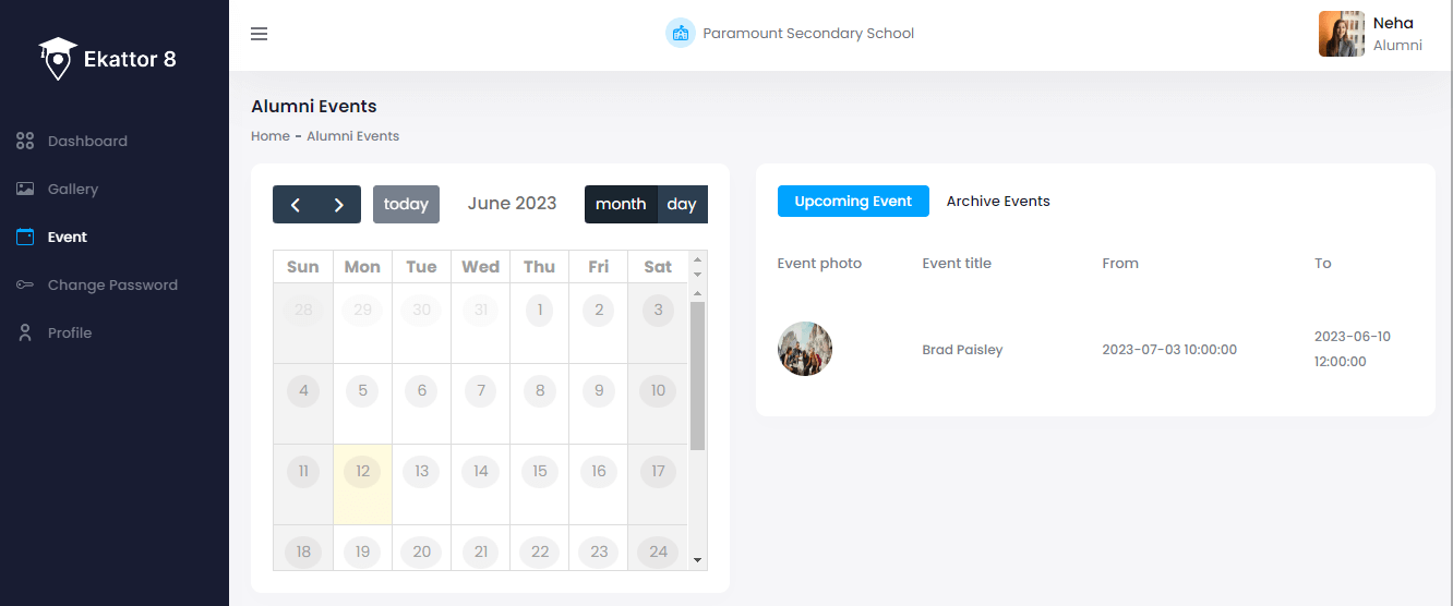 Event: In this section, alumni can view upcoming and archive events created by the admin.