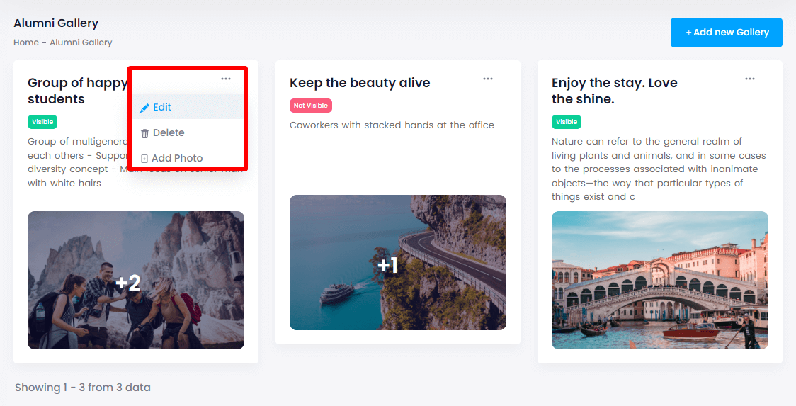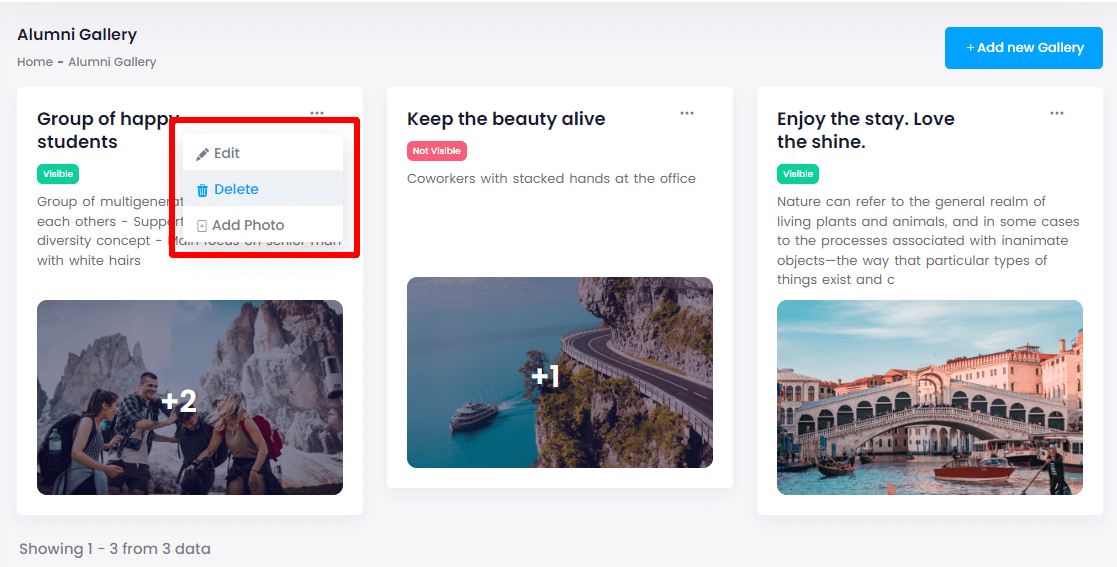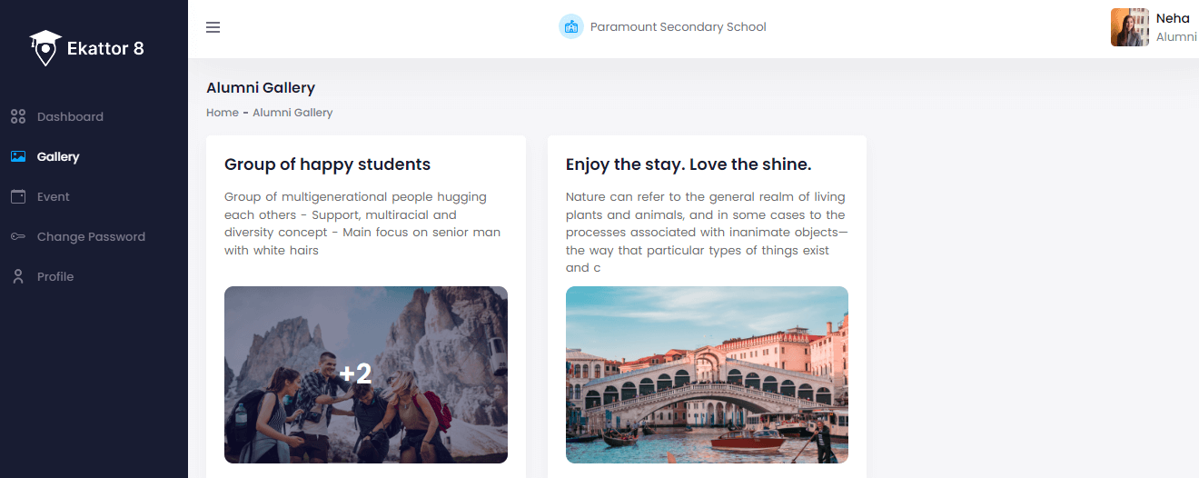 Gallery: In this gallery section alumni will be able to view the Gallery information, and photos created by the admin.