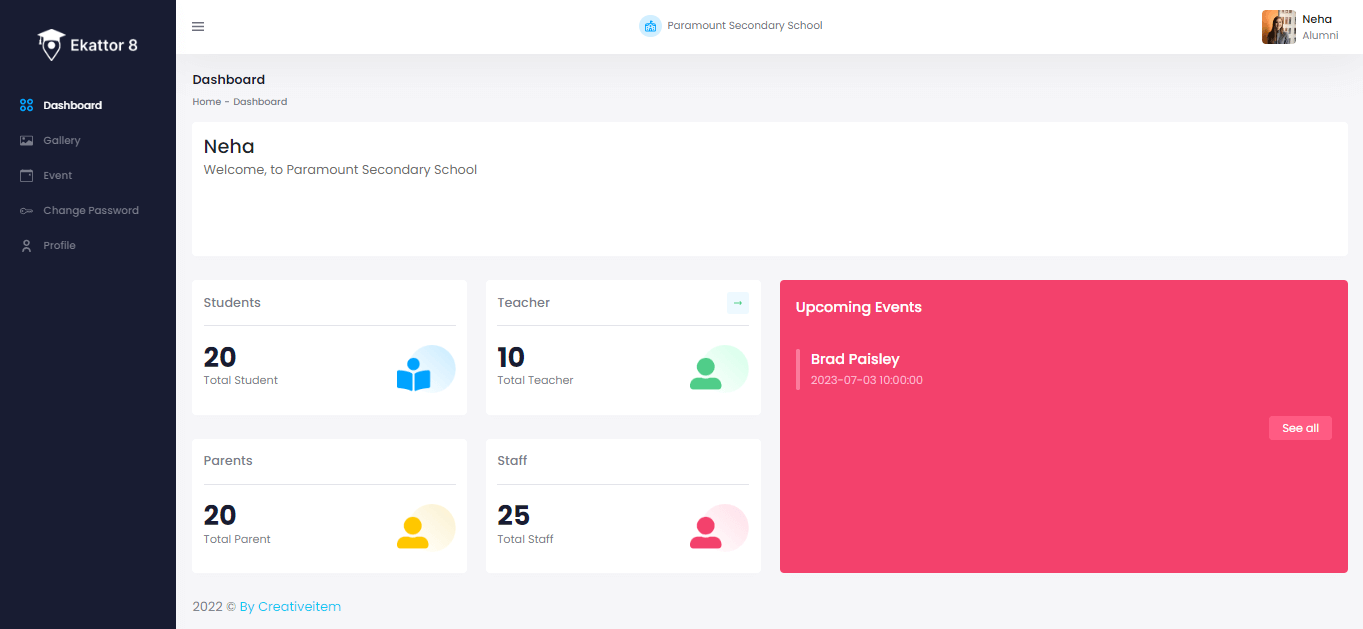 Dashboard: Here in Dashboard, alumni will get a welcome message & be able to view the information about their school, their upcoming event, and the total number of students, teachers, staff, and parents.