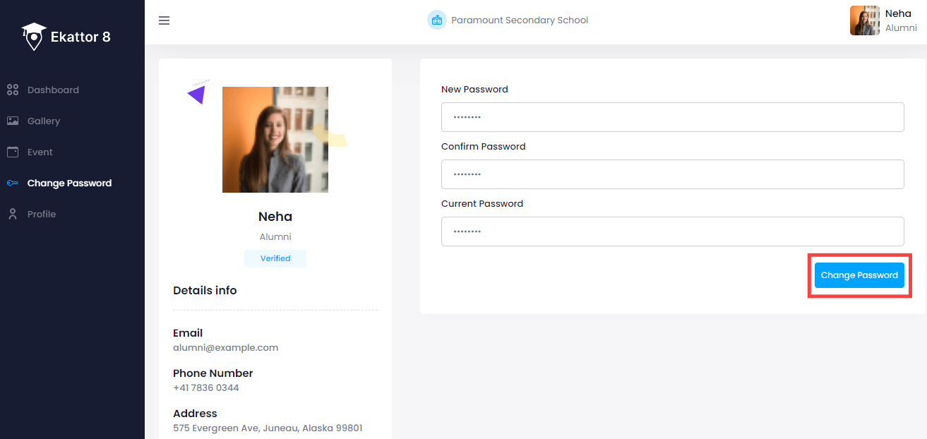 Change Password: Alumni have the authority to change and update their password. They can change their password from this section. To update their password here they need to provide;