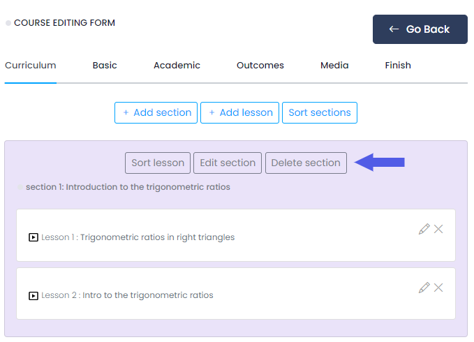 For deleting a lesson you need to click on the "X" button from the lesson section.