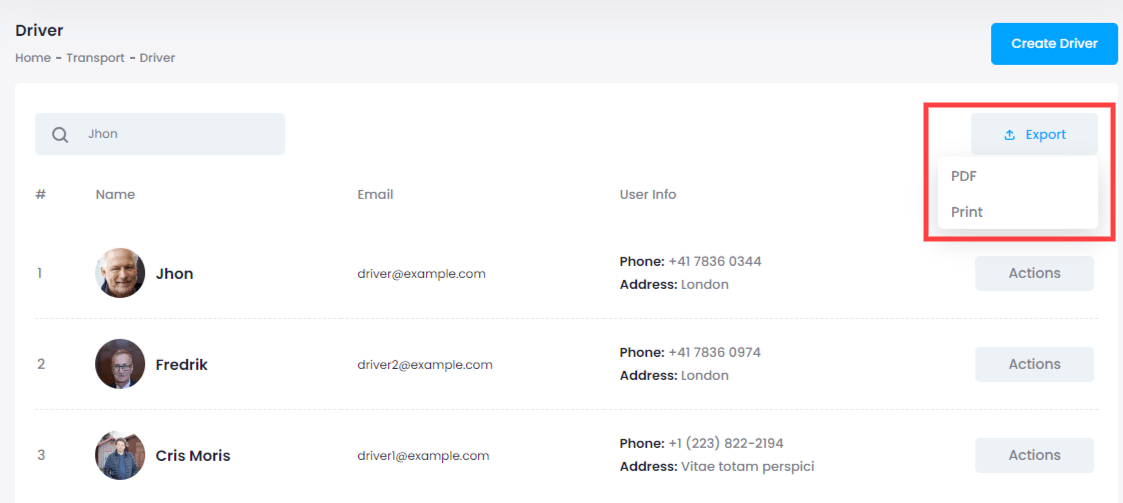 You can make a PDF file or Print the list of the drivers by clicking on the button called "Export" from the right side.