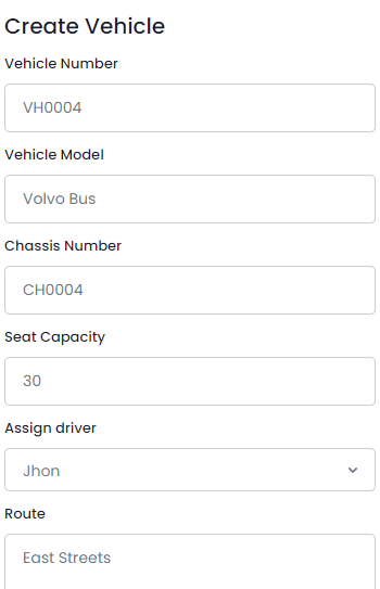 Note: One driver can be assigned with more than one vehicle but one vehicle can not be assigned by two drivers. If you try to add another driver in one vehicle it will show a "Vehicle information exists" notification.