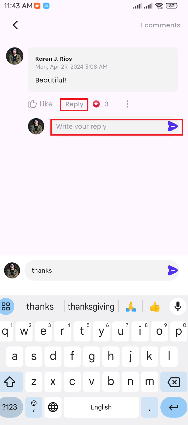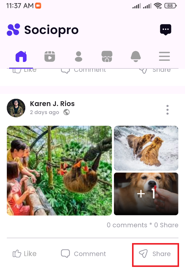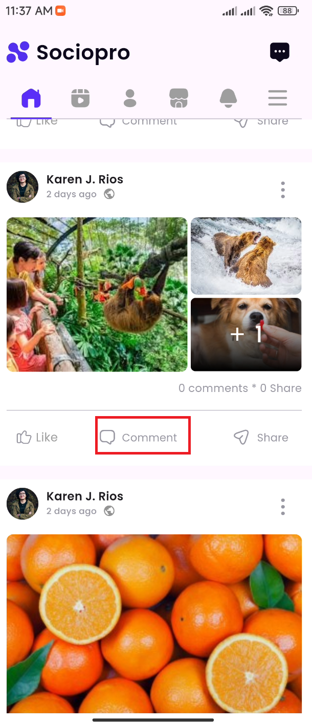 On Sociopro, users can interact with posts from friends, pages, or groups they follow or have joined by commenting and adding reactions. Users can leave comments and express their feelings using various emojis such as like, love, haha, cry and angry. Only one type of emoji/reaction can be used per post or comment at a time.
