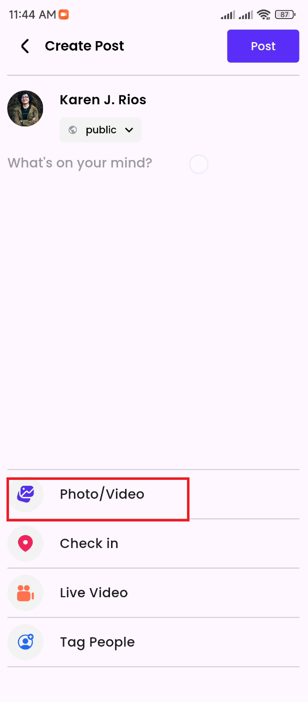 These are from friends, groups, or pages they follow. Users can also upload and manage their own text, image, and video posts directly from the timeline.
