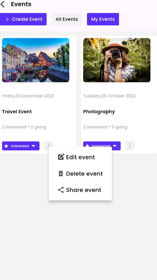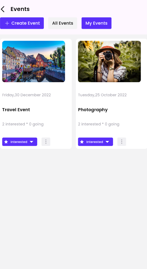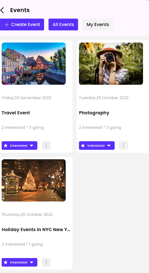 Users on Sociopro can explore and engage with public events from their accounts. They can view details of these events and choose to mark themselves as interested or going. For public events, other users can also view all activities related to the event, fostering community engagement and interaction.