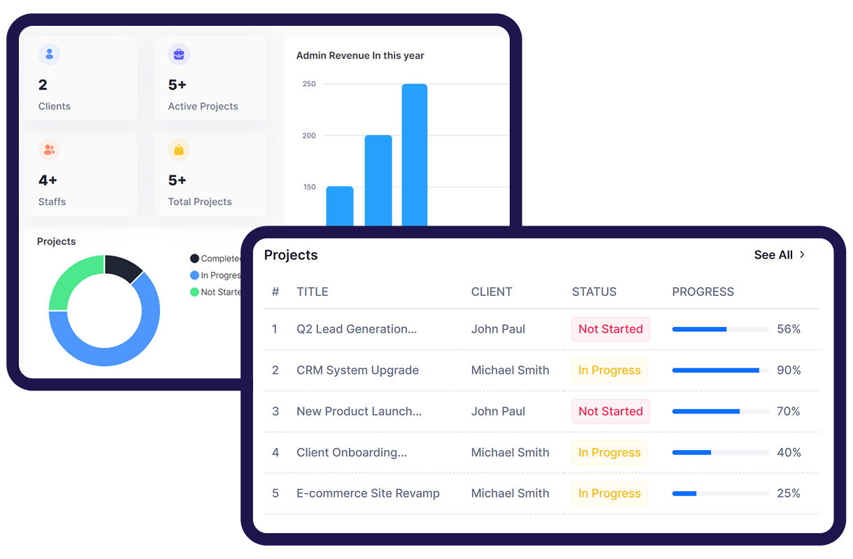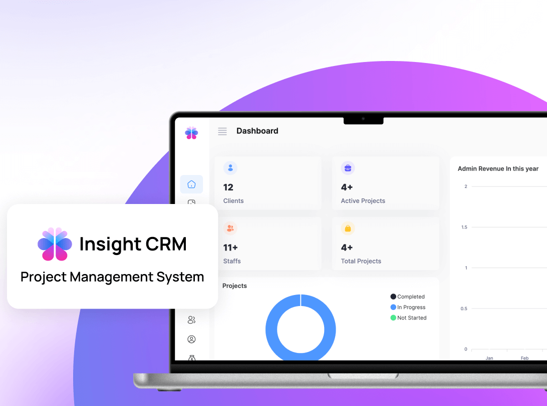 Insight CRM provides a unified admin dashboard to monitor projects, track performance, and manage teams efficiently in a single view.
