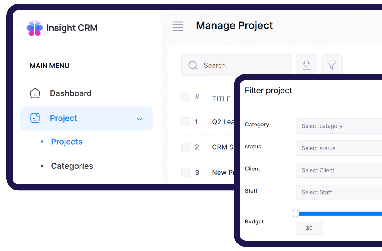 Insight CRM helps locate projects by category, client, status, staff, or budget, making project tracking faster and more efficient.