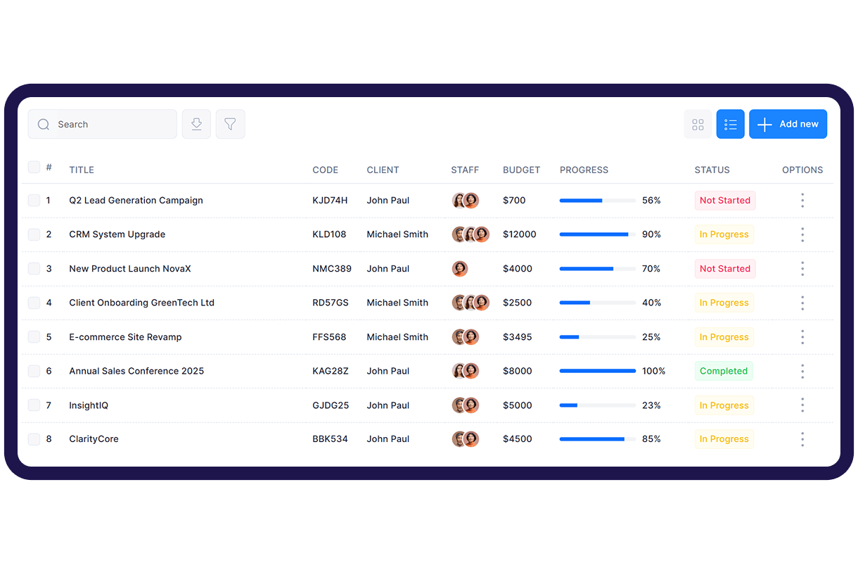 Projects in both grid and list formats for better organization, flexible management, and improved visibility across all tasks and workflows.